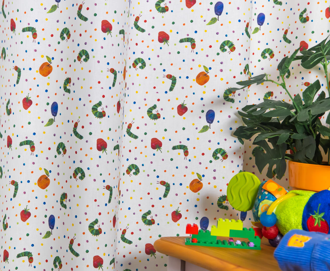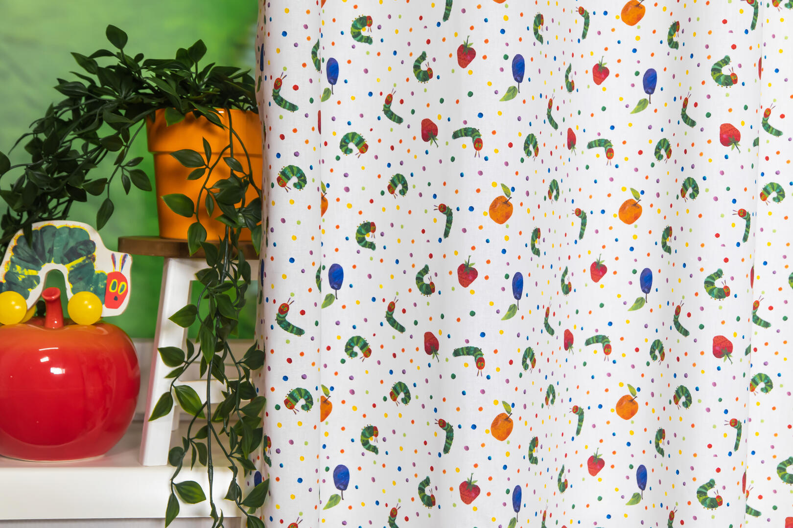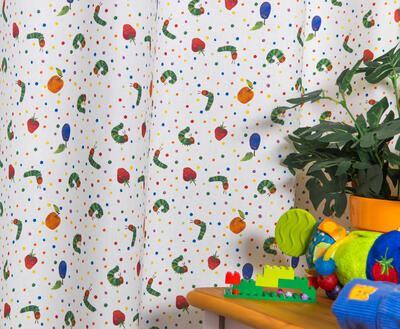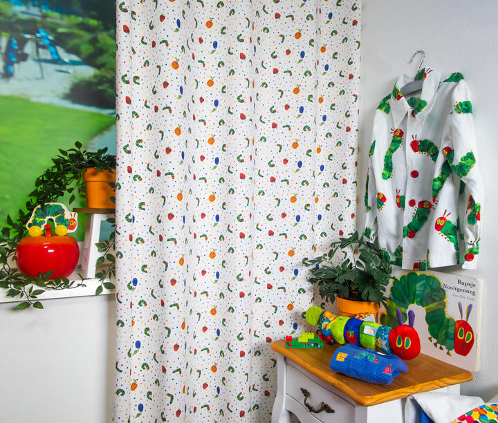 Deze gordijnstof met de naam The very hungry Caterpillar is gemaakt van de beste materialen waardoor het gordijn mooi in de plooi valt.