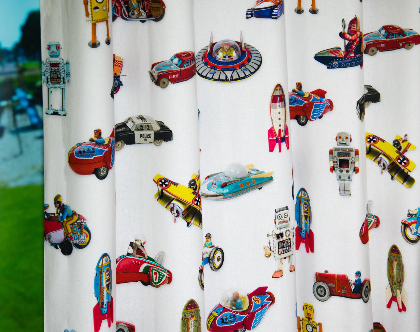 Deze gordijnstof met de naam Tin Toys is gemaakt van de beste materialen waardoor het gordijn mooi in de plooi valt.