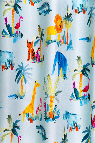 Een TOPPERTJE, dat is dit kindergordijn! Vrolijke dieren zijn afgebeeld op strelend zachte stof. De print is leverbaar in 3 ondergrondkleuren, een warm-wit, lichtblauw en donkerblauw. De safari dieren zijn met een vlotte penseel techniek als het ware geschilderd op de gordijnstof. Dat geeft een speels effect. De flamingo is 8 cm groot, de palmboom zo’n 18 cm. De achterzijde van de stof is egaal gebroken wit. Zie jij dit kindergordijn al voor je? Er is zoveel leuks op te zien en de stof kan desgewenst worden verduisterd met een verduisterende voering.