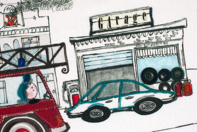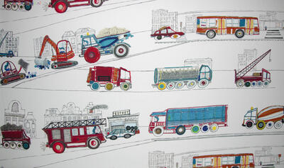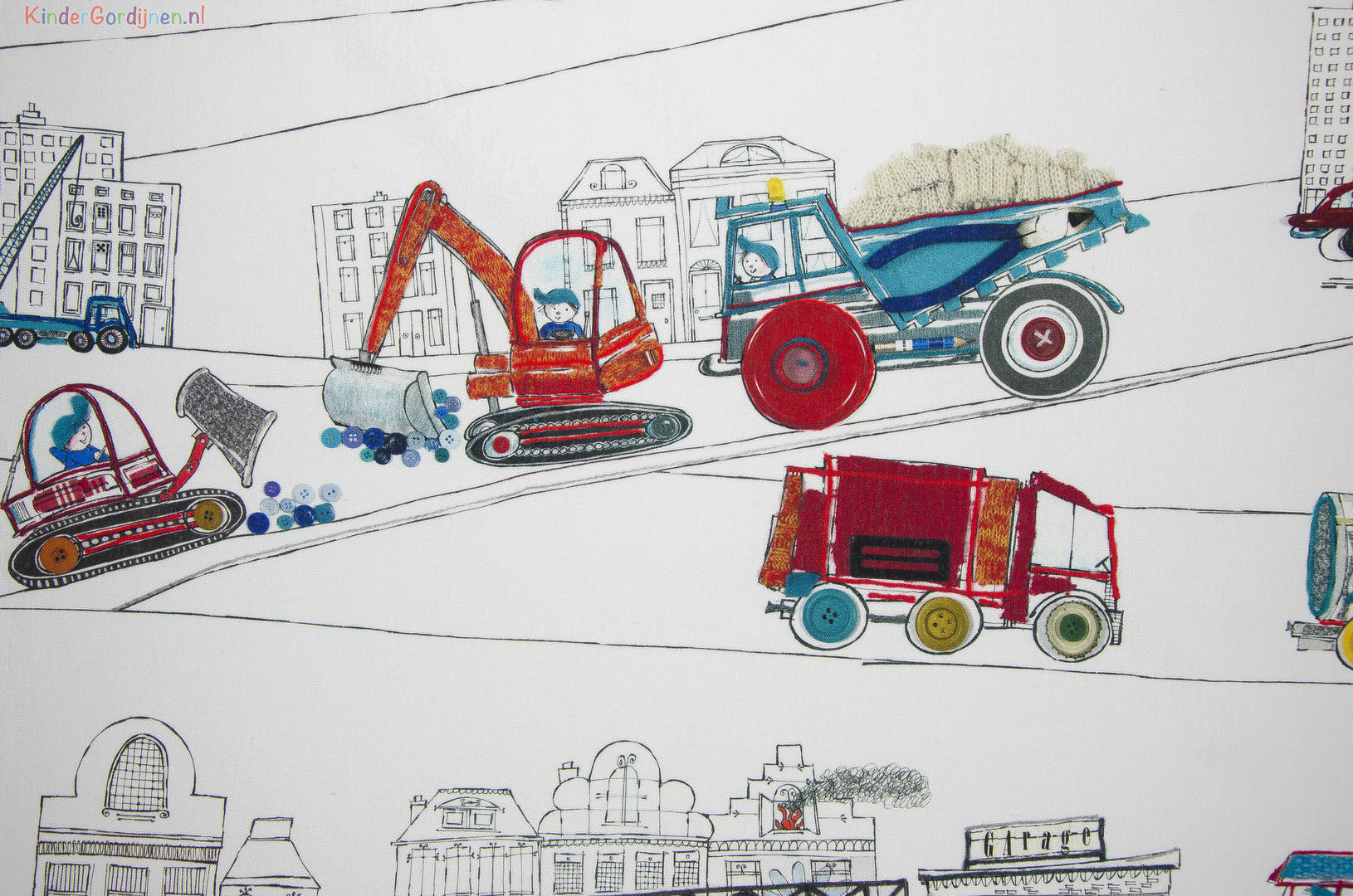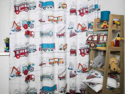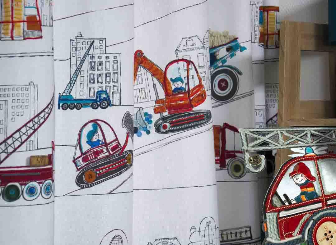 Vrachtwagens, brandweerauto's, kraanwagens... Tover de kinderkamer om tot een stoere kamer met deze gordijnen naar ontwerp van Hanneke de Jager. De print is helemaal met de hand getekend.