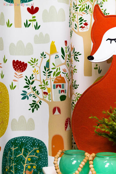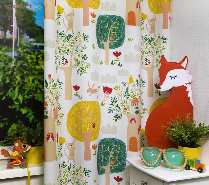 Het gordijn Treehouse brengt een levendige boswereld tot leven waarin elke centimeter iets nieuws laat zien. Tussen hoge bomen met ronde kruinen en sierlijke takken verschijnen kleine huisjes, vogels, konijntjes en nieuwsgierige eekhoorntjes. Het patroon voelt als een fantasierijk dorpje hoog tussen de boomtoppen, waar dieren wonen in boomhutten met raampjes, deurtjes en daken. Overal in het dessin zijn kleine details te vinden: blaadjes, bloemen, wolkjes en dieren die verscholen zitten tussen het groen.