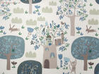 Het gordijn Treehouse brengt een levendige boswereld tot leven waarin elke centimeter iets nieuws laat zien. Tussen hoge bomen met ronde kruinen en sierlijke takken verschijnen kleine huisjes, vogels, konijntjes en nieuwsgierige eekhoorntjes. Het patroon voelt als een fantasierijk dorpje hoog tussen de boomtoppen, waar dieren wonen in boomhutten met raampjes, deurtjes en daken. Overal in het dessin zijn kleine details te vinden: blaadjes, bloemen, wolkjes en dieren die verscholen zitten tussen het groen.