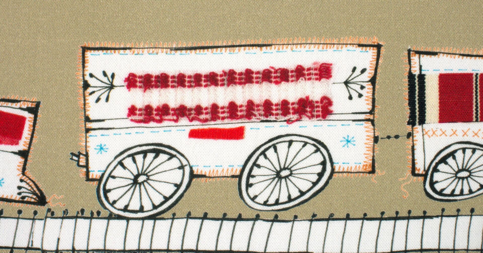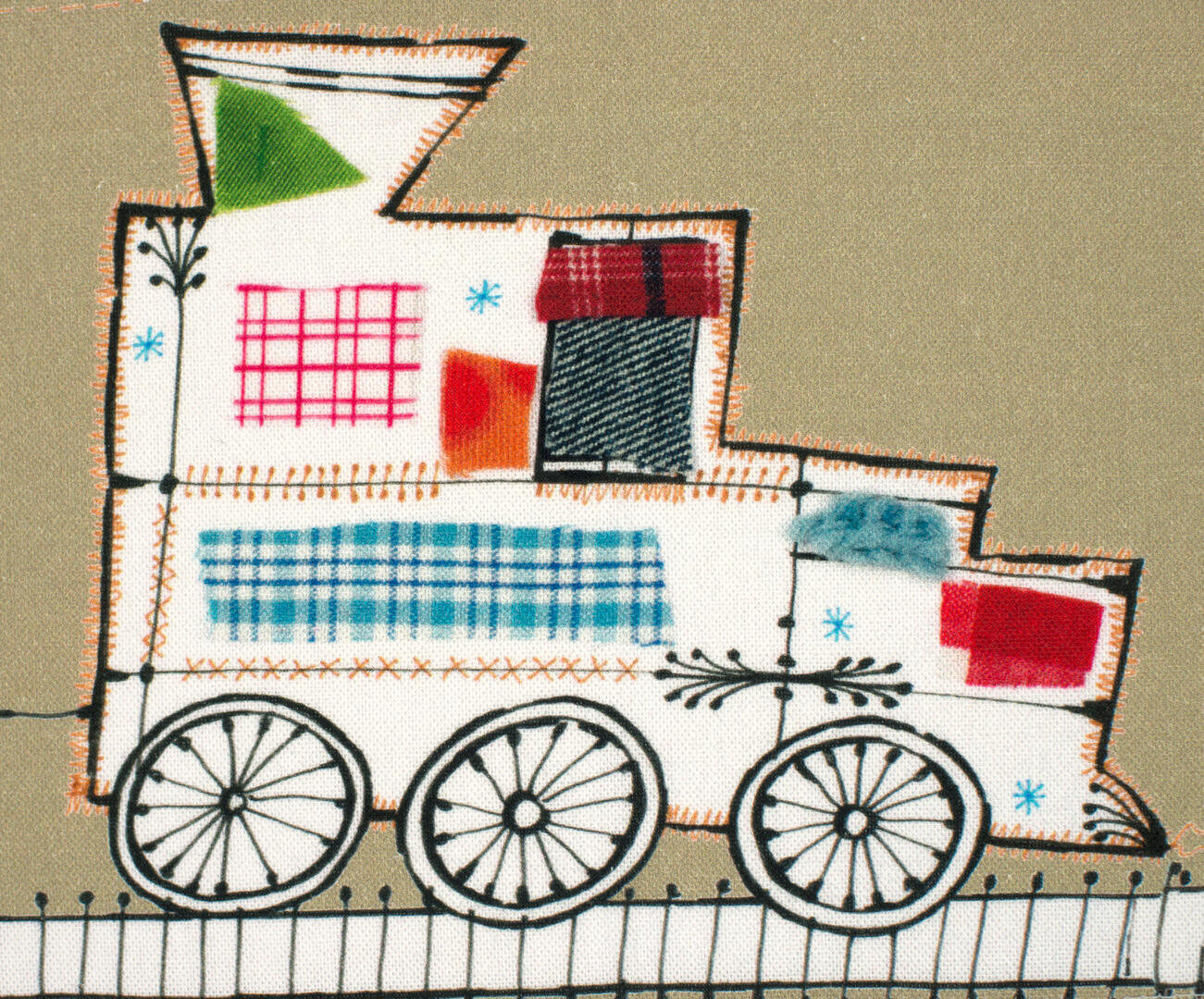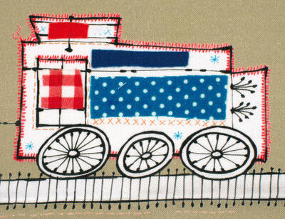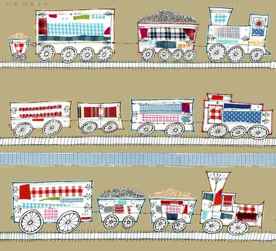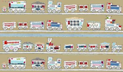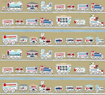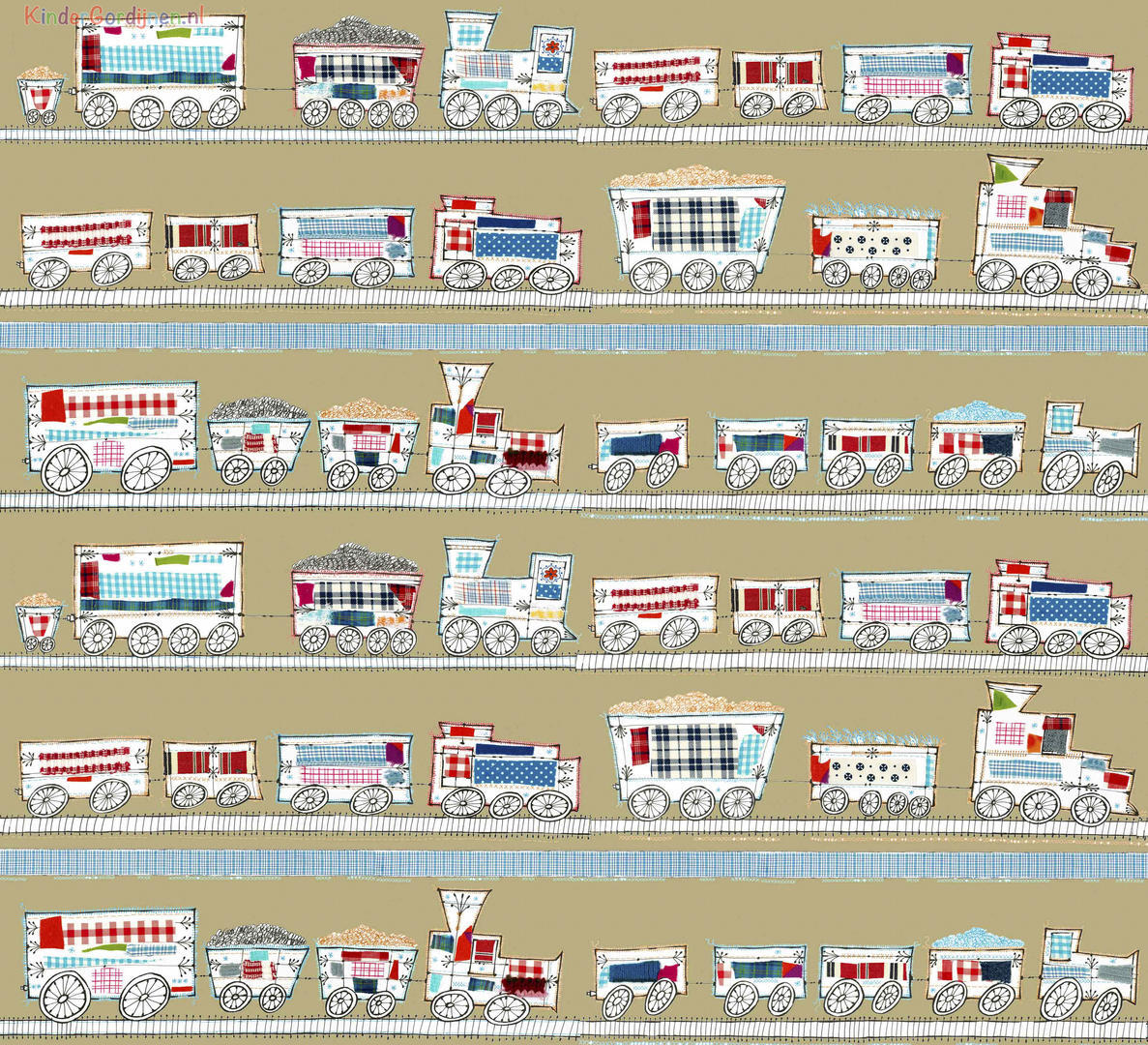 Een origineel treingordijn voor de kinderkamer, ontworpen door Hanneke de Jager. Deze beeldend kunstenares is schrijver en tevens illustrator van een aantal bijzonder leuke kinderboeken. Zij omschrijft haar stijl als: Fris, kleurrijk, levendig, speels en zonnig. Door gebruik van verschillende materialen zoals stofjes van de markt, knopen en gebreide truien, geeft zij haar illustraties iets unieks. In het patroon zie je namelijk de weergave van die leuke details. Zo is de locomotief voorzien van leuke patchwork stofjes en zig-zag steekjes rondom.