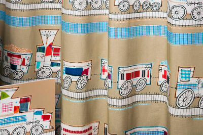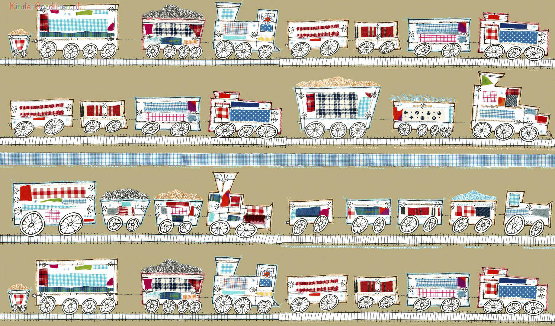 Het stylen van de kinderkamer is geweldig leuk om te doen en hoe bijzonder is het om een gordijn van een échte ontwerpster te hebben! Dit kindergordijn is gedrukt op een diepe zandkleurige (haast fraai licht olijfgroene) soepel vallende stof. De print is op de voorzijde gedrukt en als je goed kijkt zie je die kenmerkende Hanneke details. Doordat de treintjes horizontaal herhalend over het getekende spoor rijden, is dit een rustig en toch heel vrolijk gordijn. De goederenwagons zijn zo'n 13 x 10 cm groot (b x h) en haast voelbaar echt gedecoreerd met wol, lapjes en steekjes. Mag jouw eigen lieveling op een bijzondere manier naar dromenland? Geef je eigen topper dan een fantasierijk Hanneke de Jager kindergordijn!