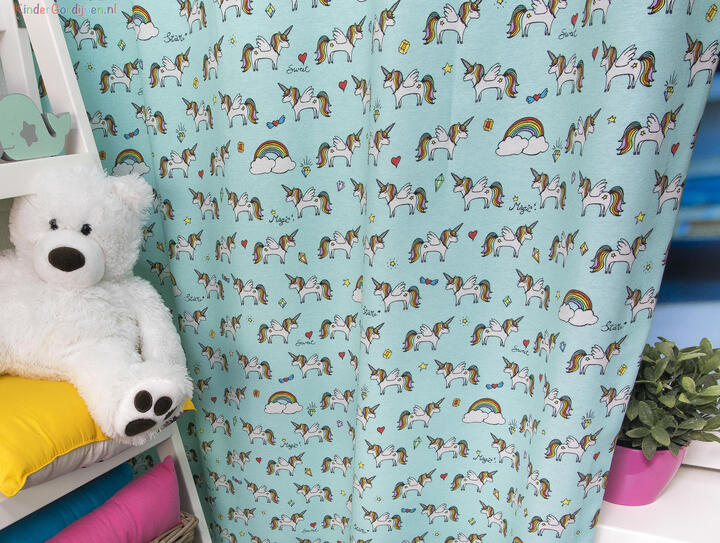 Het Unicorn Starmint is een betoverend kindergordijn voor de kamer van je kind. Dit gordijn, gemaakt van dikke katoenen stof, toont levendige eenhoornpaartjes te midden van sterretjes, edelstenen, smaragden, rode hartjes en wolken, omringd door schitterende regenbogen in bekende kleuren. Een absolute favoriet onder jonge meisjes!
