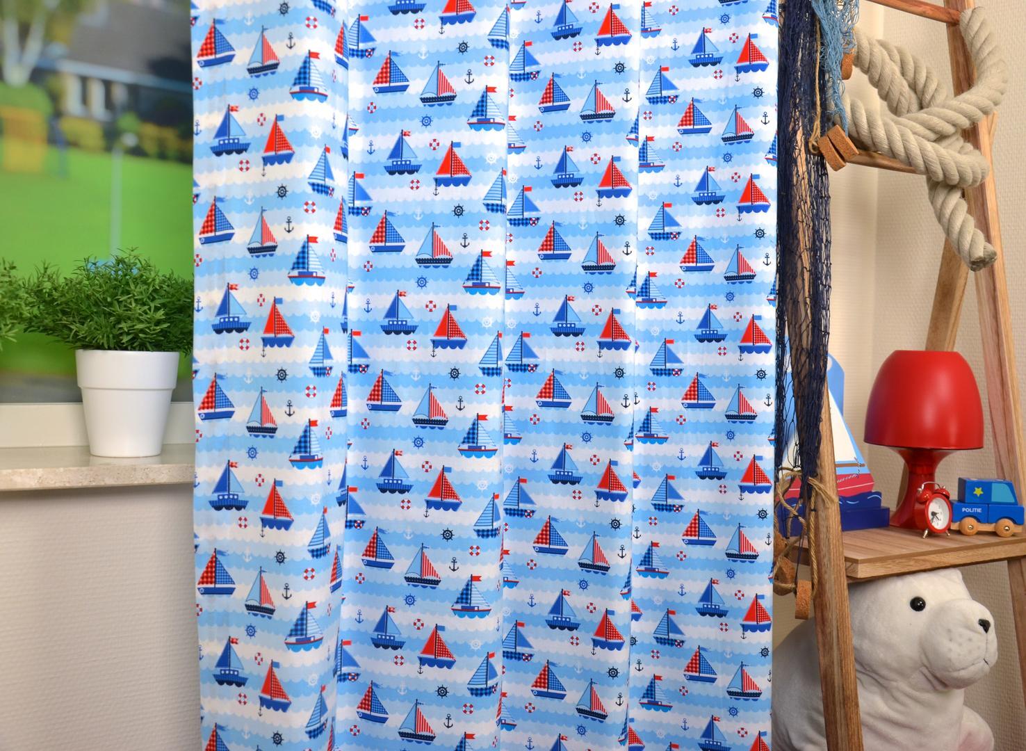 Het Vela Baby- en Kindergordijn is gemaakt van een fijn geweven, hoogwaardige katoenen stof die comfortabel aanvoelt en stevig aan elkaar is gezet voor dagelijks gebruik. De print is haarscherp en helder van kleur, waardoor elk detail tot leven komt. Het dessin bestaat uit vrolijke zeilbootjes in rood, wit en blauw, varend op lichtblauwe golven die speels over de stof lopen. Tussen de bootjes zijn kleine ankers, reddingsboeien en scheepssturen te zien, die het geheel een maritiem karakter geven. De afwisseling van ruitjespatronen en effen zeilen zorgt voor een levendige uitstraling, zonder dat het druk oogt. De kleurencombinatie van fris blauw met warme rode accenten maakt dit gordijn geschikt voor zowel jongens- als meisjeskamers. Het patroon straalt rust uit, terwijl het tegelijkertijd een speels en avontuurlijk gevoel toevoegt aan de kinderkamer. Dankzij het tijdloze ontwerp blijft deze stof passend voor alle kinderleeftijden – van babykamer tot tienerkamer. Wij hebben deze stof ruim op voorraad, zodat we snel kunnen leveren. Wil je het materiaal eerst in handen hebben voordat je een op maat gemaakt gordijn bestelt? Bestel dan een knipstaal om de textuur en kleurtinten zelf te beoordelen. In de meeste gevallen wordt het staaltje dezelfde dag nog verzonden. Voor extra isolatie en verduistering kun je tijdens het bestelproces de optie “Voering” selecteren.