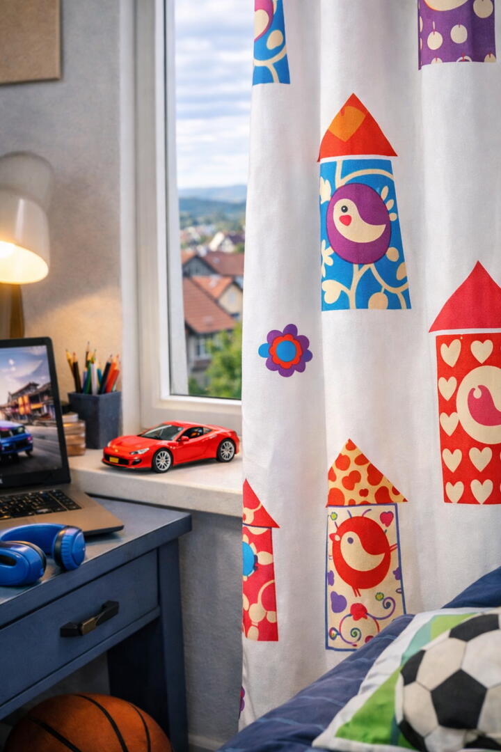 De print is vrolijk zonder kinderachtig te worden, waardoor het gordijn jarenlang mooi blijft – van peuterkamer tot tienerkamer.