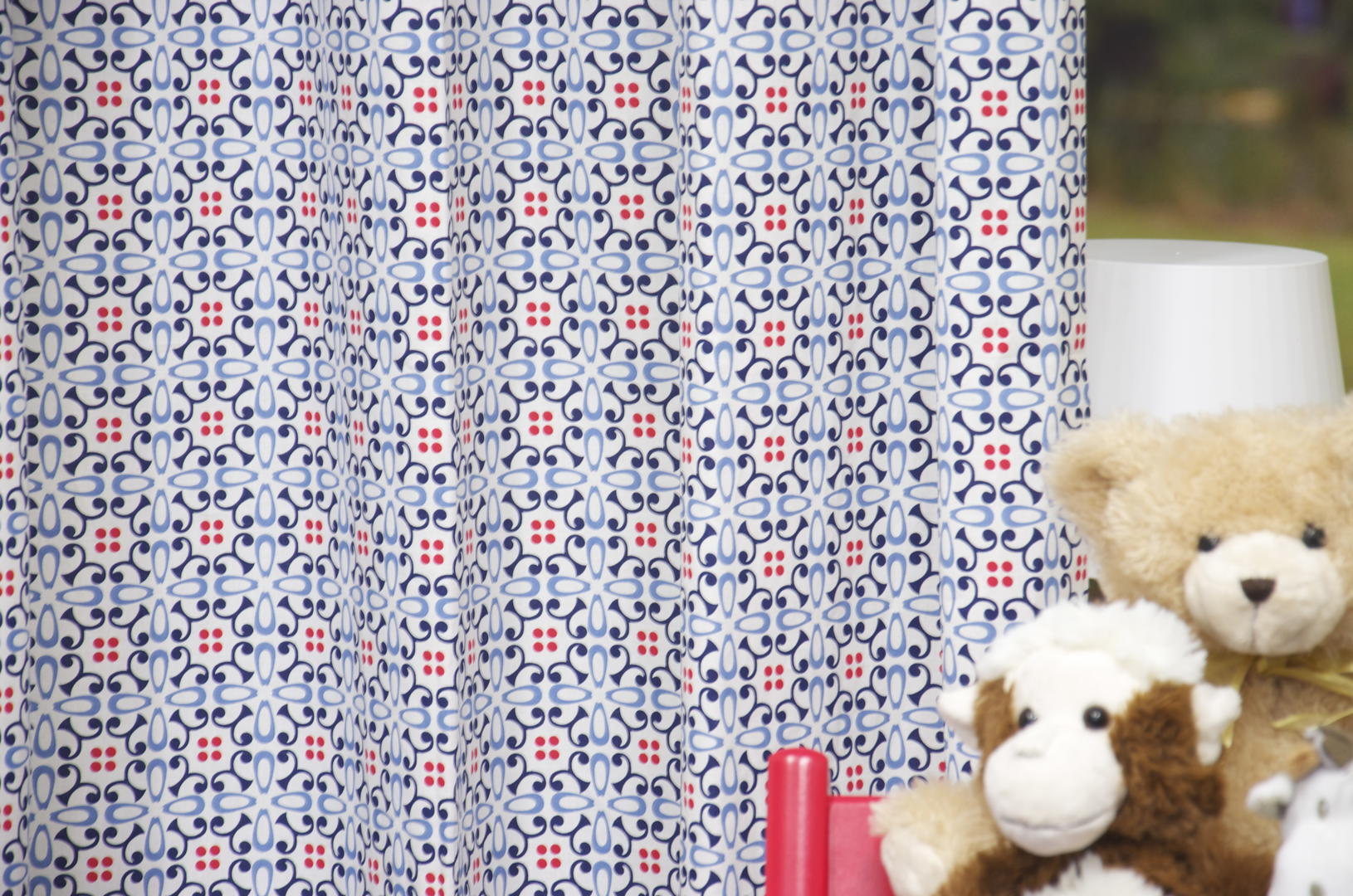 Vrolijk en lief tegelijk. Frisse mini tegelprintje, gedrukt op een dunne soepel vallende katoenen gordijnstof. De print is aan de achterzijde licht zichtbaar. Ook heel leuk voor toepassing in een kinderkamer] Te combineren met gordijnstof Marenthe met een patchworkprint of Mila met bloemprint uit dit patchworkdessin. Designed by Cozz.