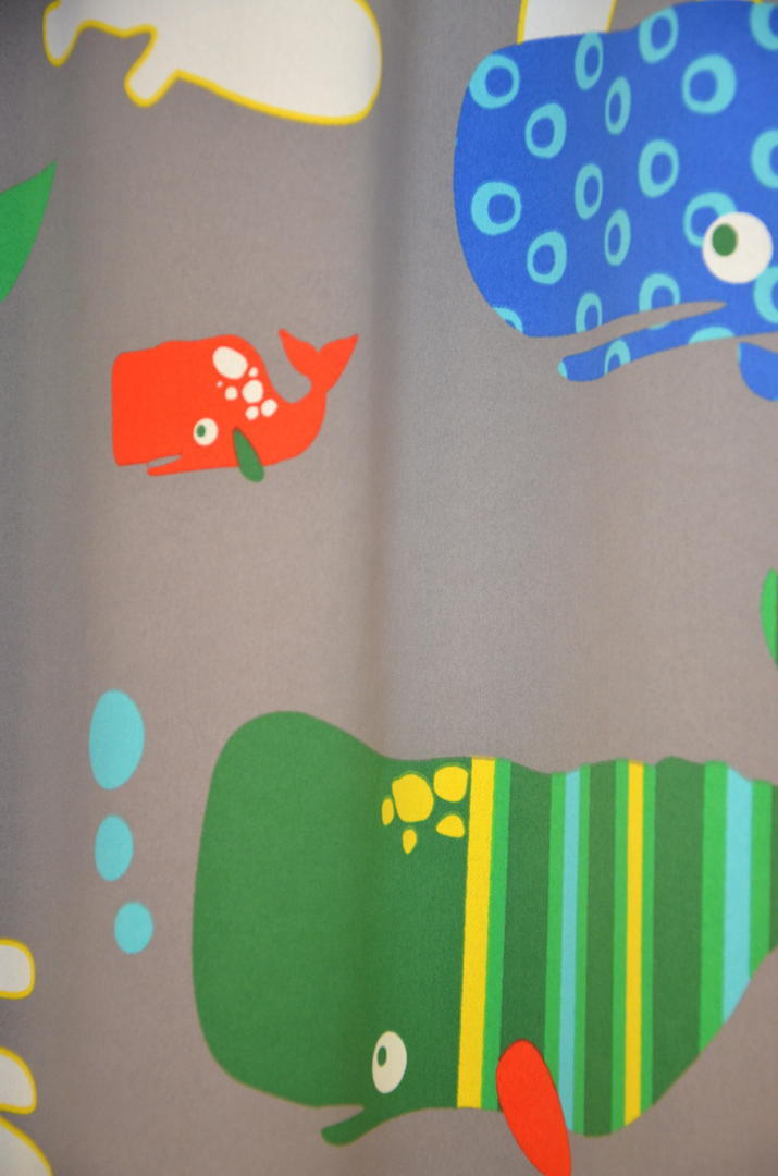 Verduisterende gordijnstof met kleurrijke print van walvissen op de voorzijde en een klein motiefje aan de achterzijde. Ideale gordijnen voor een kinderkamer.